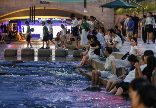 ▲30일 저녁 서울 중구 청계천을 찾은 시민들이 물에 발을 담그며 무더위를 식히고 있다.(사진= 뉴스1) |