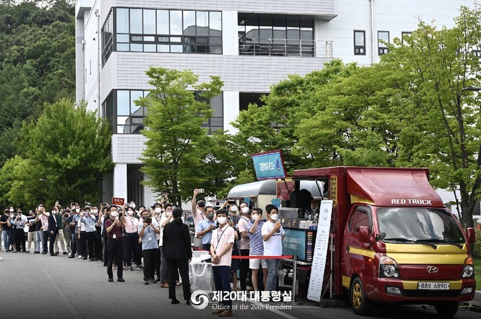 ▲ 한국항공우주연구원 소속 연구원들이 6일 오후 윤 대통령이 보낸 커피차에서 주문하기 위해 줄을 서고 있다.(사진=대통령실) |