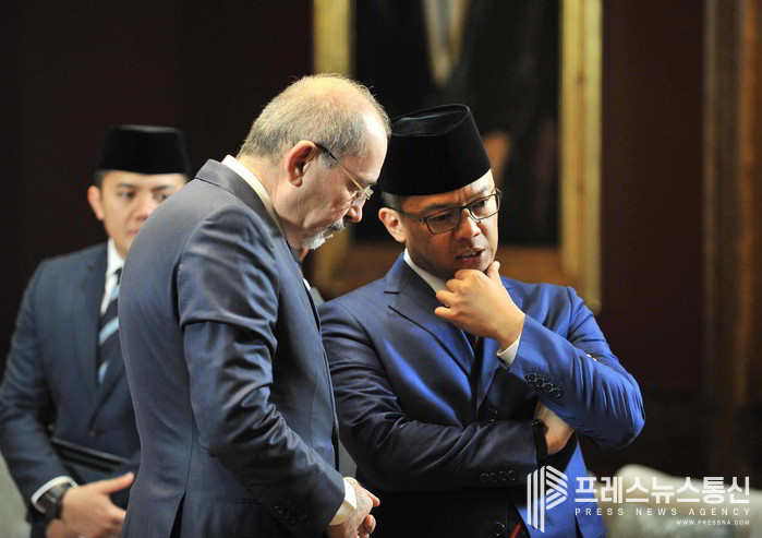 [프레스뉴스] 채정병 특파원=25일(현지시간) 프라보워 수비안토 인도네시아 대통령을 수행해 요르단을 방문한 수기오노(오른쪽) 인도네시아 외무장관이 양국 정상회담 전 아이만 사파디 요르단 외무장관과 진지하게 대화하고 있다. 요르단-인도네시아 정상은 회담에서 75년 넘게 이어온 양국의 긴밀한 관계를 재확인하고 중동지역 정세에 관해 논의했다. (사진=채정병 특파원)