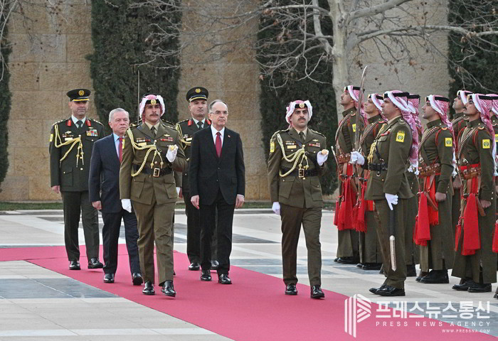 [프레스뉴스] 채정병 특파원=22일(현지시간) 바이람 베가이 알바니아 대통령이 요르단을 공식 방문한 가운데 알 후세이니아 궁전에서 열린 환영식에서 양국 정상이 의장대를 사열하고 있다. (사진=채정병 특파원)