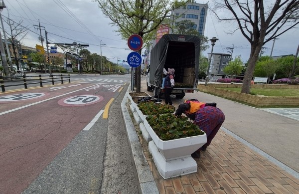 거창IC 입구, 거창교 위, 거창읍 행정복지센터 주변 등 유동인구가 많은 시가지 대형 화분 171개에 식재해 화사한 거리 경관을 조성했다.