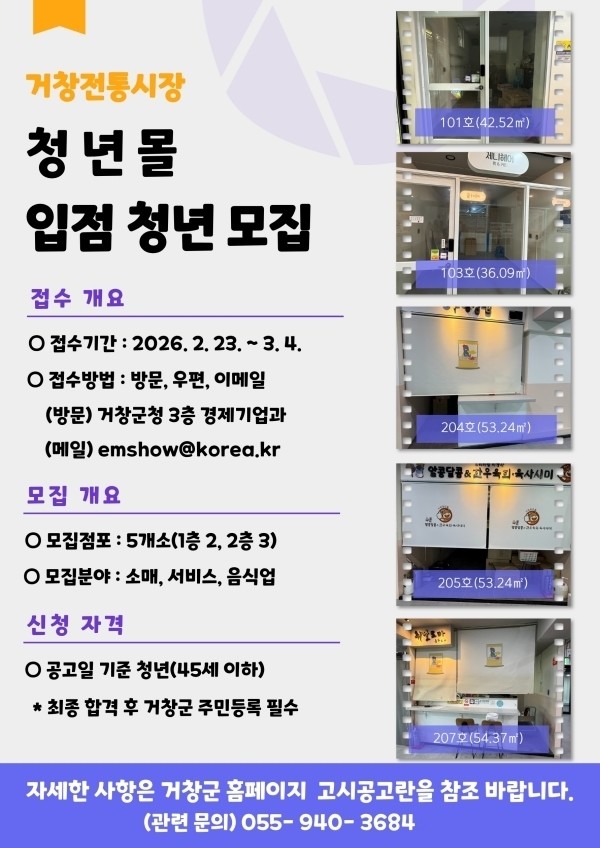 자세한 내용은 거창군 누리집 공고문을 참고하거나 거창군청 경제기업과(☎055-940-3684)로 문의하면 된다.