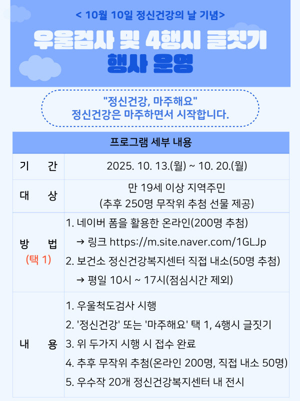 이번 행사는 만 19세 이상 지역 주민을 대상으로 진행되며, 우울감 조기 발견과 긍정적인 정신건강 메시지 확산을 위해 기획됐다.