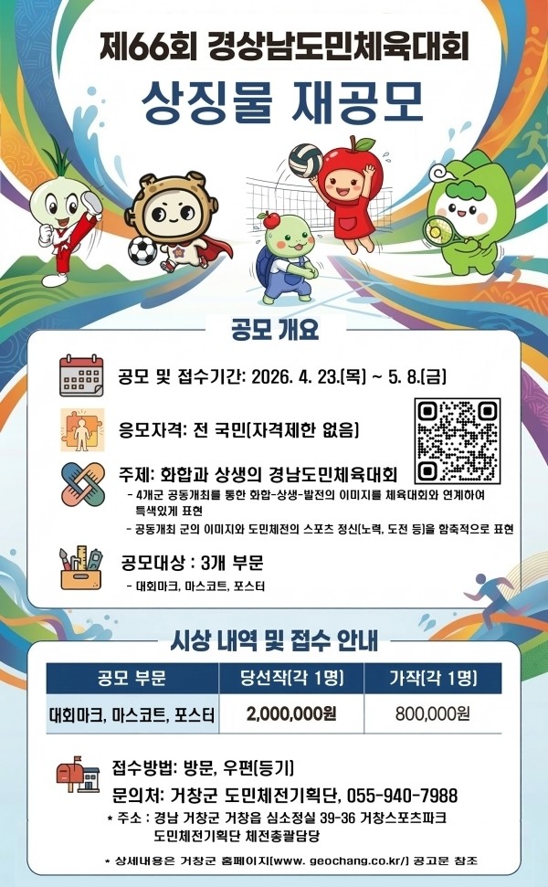 공모대상은 ▲대회마크 ▲마스코트 ▲포스터 등 총 3개 분야로 도민체육대회를 대표할 수 있는 상징물 전반이며, 거창군을 비롯한 공동개최 4개군(산청?함양?거창?합천)의 공동 개최 의미를 시각적으로 표현하는 요소가 중요하게 평가된다.