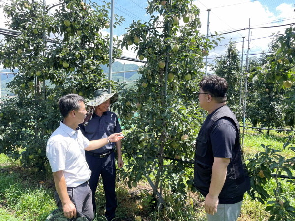 또한 영농기술지원단 현장 예찰 결과 사과 갈반병, 탄저병, 복숭아순나방이 일부 과원에서 발생하여 발병 과실 신속 제거, 적용약제 살포 등 병해충 관리를 위한 현장 지도를 적극 추진하고 있다.