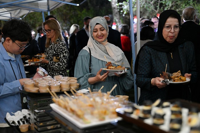 [프레스뉴스] 채정병 특파원=30일(현지시간) 주 요르단 대한민국 대사관 주최 개천절 국경일 행사가 대사관 관저 정원에서 열린 가운데 한 여성이 진열된 한국 음식을 흐뭇하게 바라보고 있다.