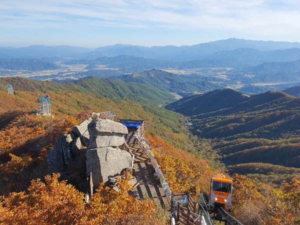 절정의 단풍 속 대봉산을 더욱 특별하게 만드는 것은 국내 최장 길이인 3.93km의 모노레일과 자유비행 방식으로 국내 최장거리인 3.27km의 집라인으로 대봉산 절경을 짜릿하고 생생하게 눈앞에서 느낄 수 있다.