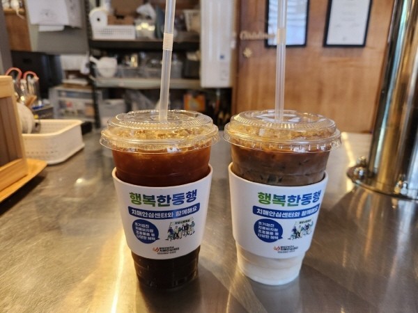 컵홀더에는 ‘행복한 동행 치매안심센터와 함께해요’라는 문구와 함께 조기검진과 치료비 지원 등 치매안심센터에서 진행하는 지원 내용을 안내하고 있다.