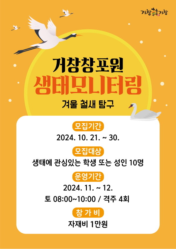 참가자 10명을 선착순 모집하는 생태 모니터링 프로그램은 거창창포원을 찾는 겨울 철새들을 관찰하고 기록하는 활동으로, 11월부터 12월까지 매주 주말 오전 8시부터 10시까지 총 4회에 걸쳐 진행된다.
