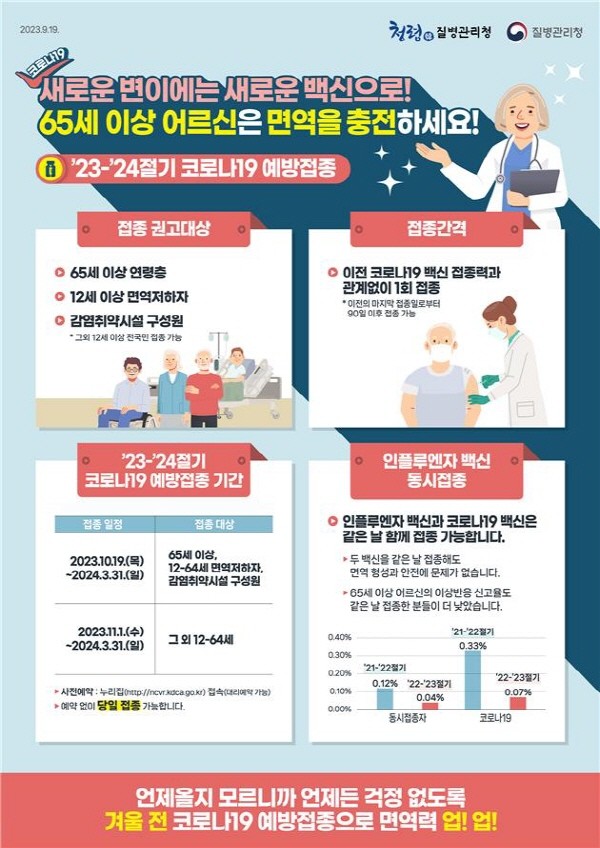 접종 기간은 고위험군의 경우 2023년 10월 19일부터 2024년 3월 31일까지이며, 그 외 대상자는 2023년 11월 1일부터 접종할 수 있다.