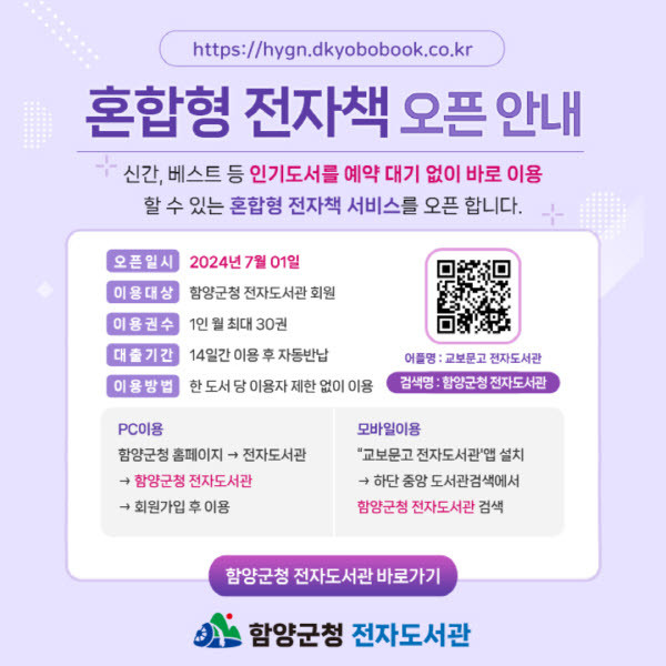 전자책 서비스는 함양군민이라면 누구나 이용이 가능하며, 함양군청 누리집과 교보도서관 모바일 어플에서 전자책을 볼 수 있다.