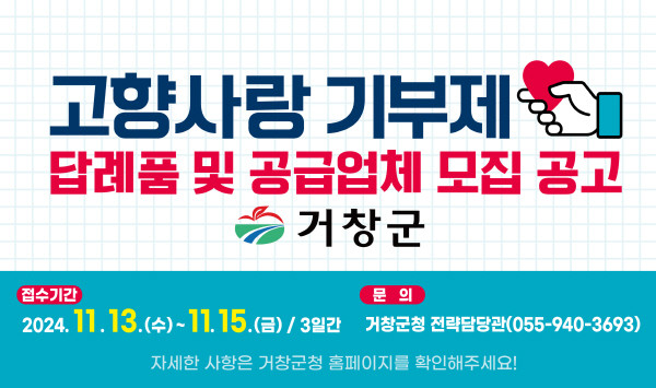 모집 대상은 현재 거창군에 사업장을 두고, 답례품으로 공급할 수 있는 품목을 생산·제조·공급할 수 있어야 하며, 기부 시스템인 고향사랑e음을 통해 공급해야 하는 만큼 통신판매업 등록을 완료한 업체이어야 한다.