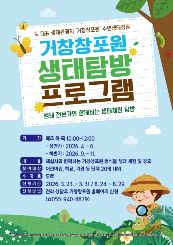 수강료는 무료이며, 신청은 거창창포원 담당자(☎055-940-8879)와 전화 상담 후 거창창포원 누리집을 통해 할 수 있다.