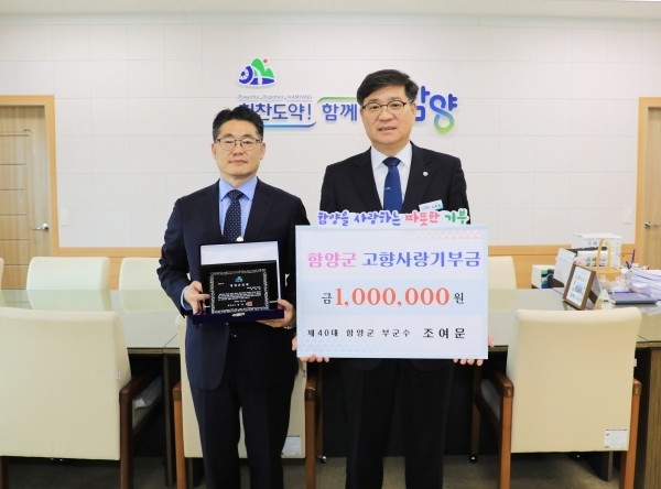 명예군민증을 받은 조 전 부군수는 함양군 발전과 주민 복리 증진을 응원하는 마음을 담아 고향사랑기부금 100만 원을 기탁하며 남다른 ‘함양 사랑’을 실천했다.