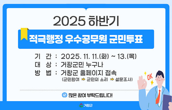 참여 방법은 간단하다. 거창군청 누리집 접속 후 ‘군민참여’ 메뉴의 ‘설문조사’란에서 투표할 수 있으며, 군민 1인당 1회 참여가 가능하다. 군은 투표 참여자 중 100명을 무작위로 추첨해 거창사랑상품권(1만 원권)을 증정할 계획이다.