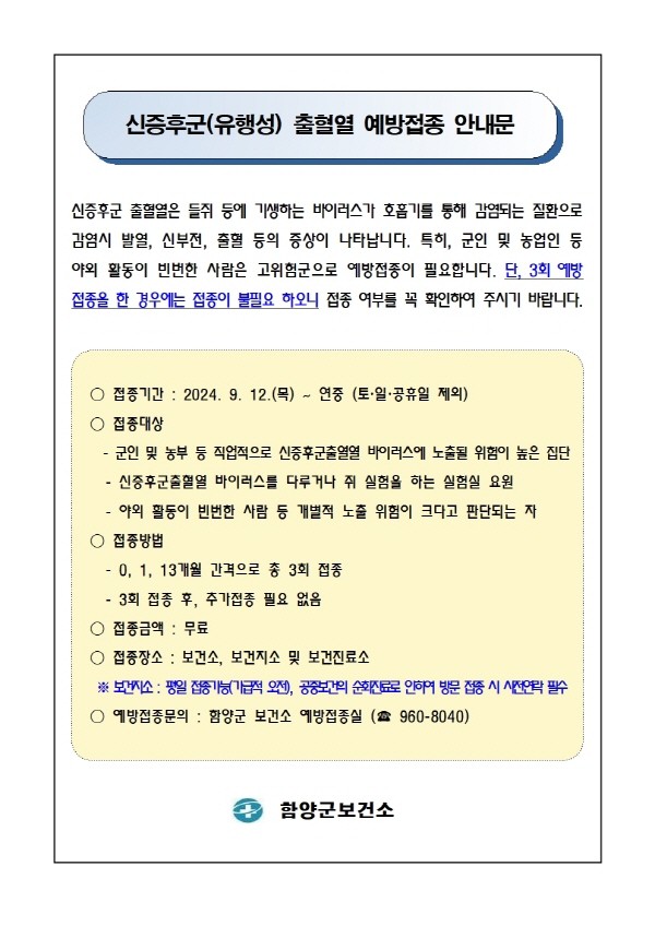 기타 신증후군출혈열 예방접종과 관련된 궁금한 사항은 함양군보건소 예방접종실(☎ 055-960-8040)로 문의하면 된다.