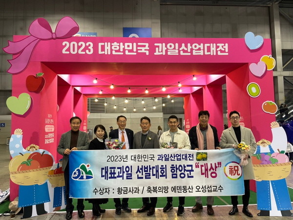 | ▲ 함양사과 대표과일 선발대회 대상 수상(에덴동산 오성섭 농가-사진 왼쪽에서 세번째)사진=함양군 |