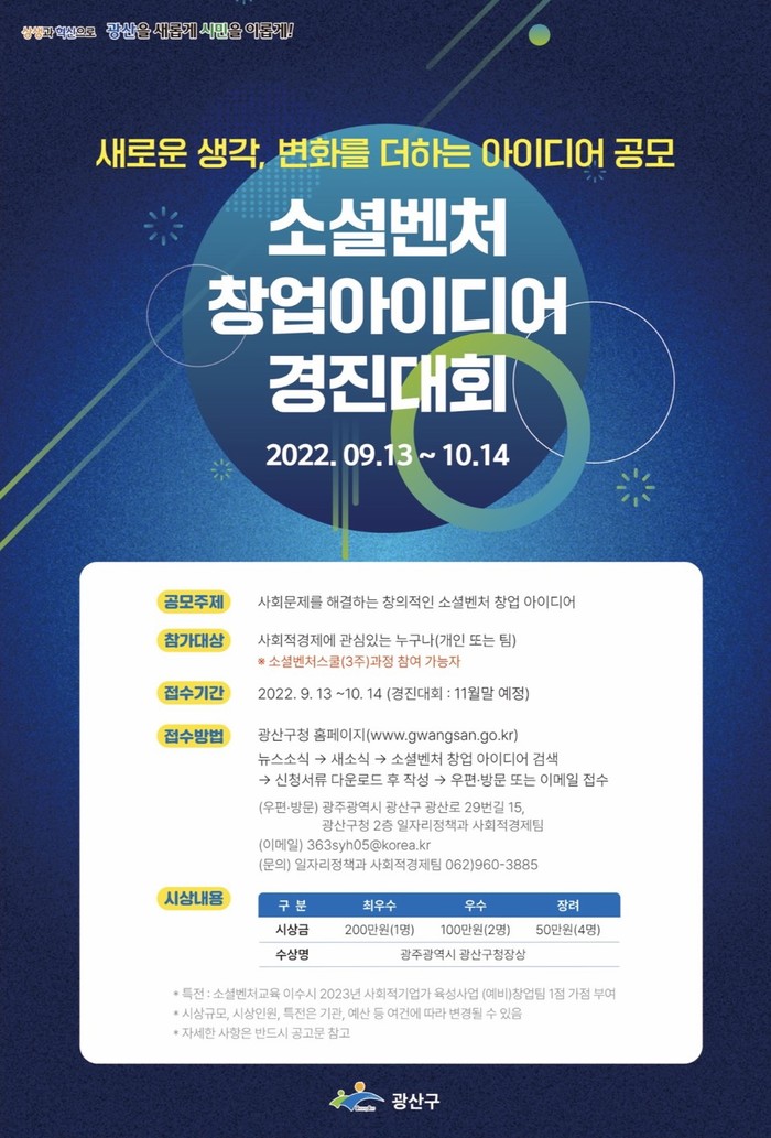 [광주=프레스뉴스] 강래성 기자= 광주 광산구(구청장 박병규)가 소셜벤처 창업 아이디어 경진대회 참가자를 모집한다.
