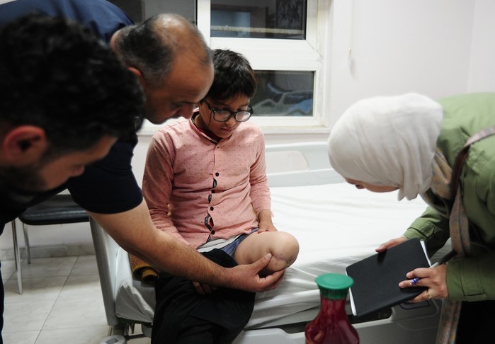 [프레스뉴스] 채정병 특파원=압둘라 2세 요르단국왕이 지난 트럼프 미국대통령과의 회담에서 밝힌 가자지구 어린이환자 2,000명에 대한 요르단 이송치료 첫번째 그룹(29명)이 4일(현지시간) 항공과 육로를 통해 요르단에 도착한 가운데 암만의 한 병원에서 의료진이 아이의 절단된 다리 상태를 살피고 있다.