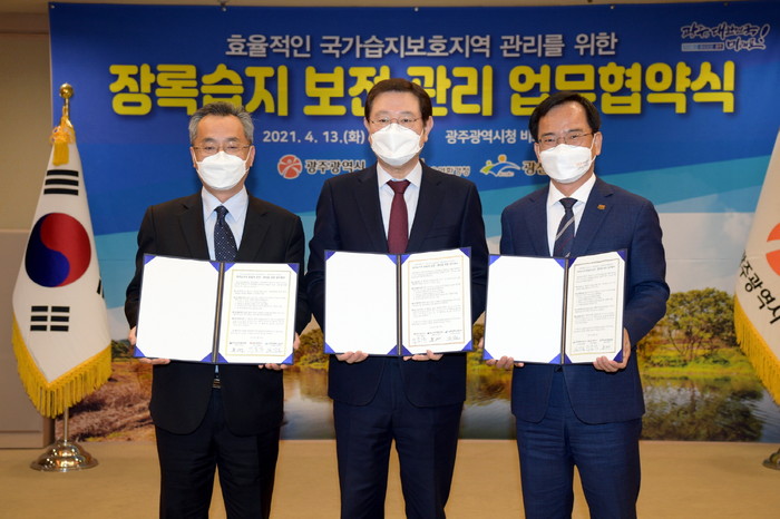 광주광역시, 영산강유역환경청, 광산구는 13일 오전 광주시청 비즈니스룸에서 이용섭 시장, 류연기 청장, 김삼호 구청장이 참석한 가운데 ‘장록습지의 효율적 보전‧관리를 위한 업무협약’을 체결했다.