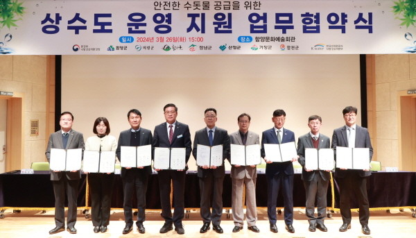 지난 26일 함양문화예술회관에서 낙동강유역환경청, 함양군 등 경남지역 7개 군 과 한국수자원공사가 참여한 가운데 상수도시설 운영 전문성 향상 및 수도사고 대응 체계 고도화를 위한 ‘상수도운영지원협의회’를 발족하고 ‘상수도시설 운영 협력 강화 협약’을 체결했다.