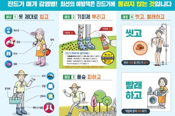 이를 위해 벌초, 성묘, 등산, 농작업 등 야외활동 시 긴 소매, 긴 바지 등으로 피부노출을 최소화하고 풀 위에 앉을 경우 돗자리 사용, 귀가 후에는 바로 옷을 세탁하고 샤워하는 등 예방수칙 준수가 중요하다.