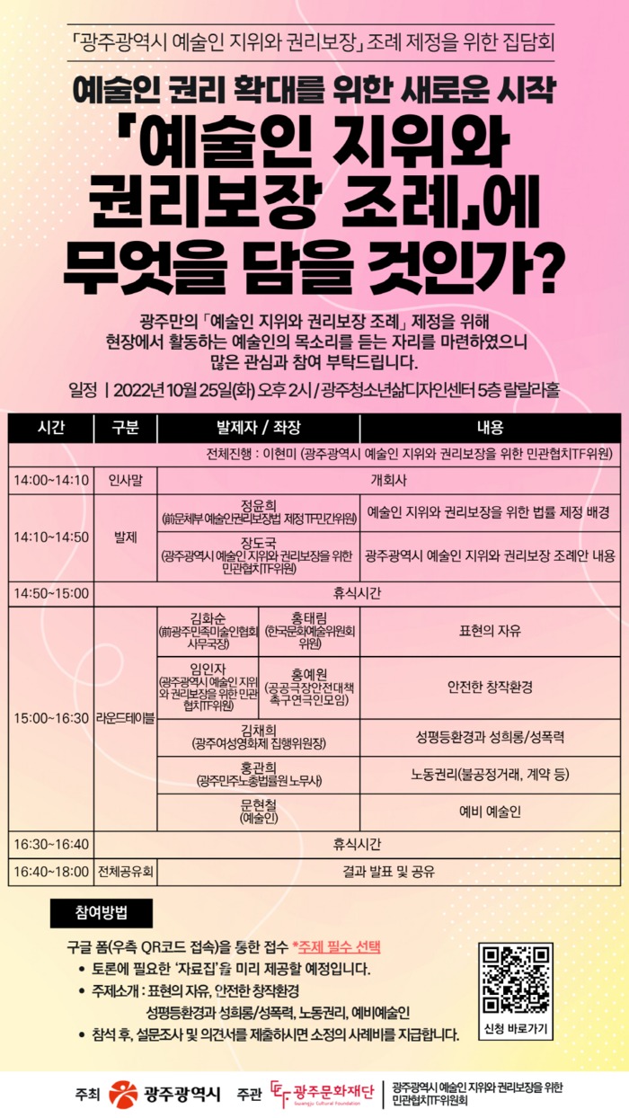 [광주=프레스뉴스] 강래성 기자= 광주광역시가 25일 광주청소년삶디자인센터에서 ‘예술인 지위와 권리보장 조례’ 제정을 위한 집담회를 개최한다.