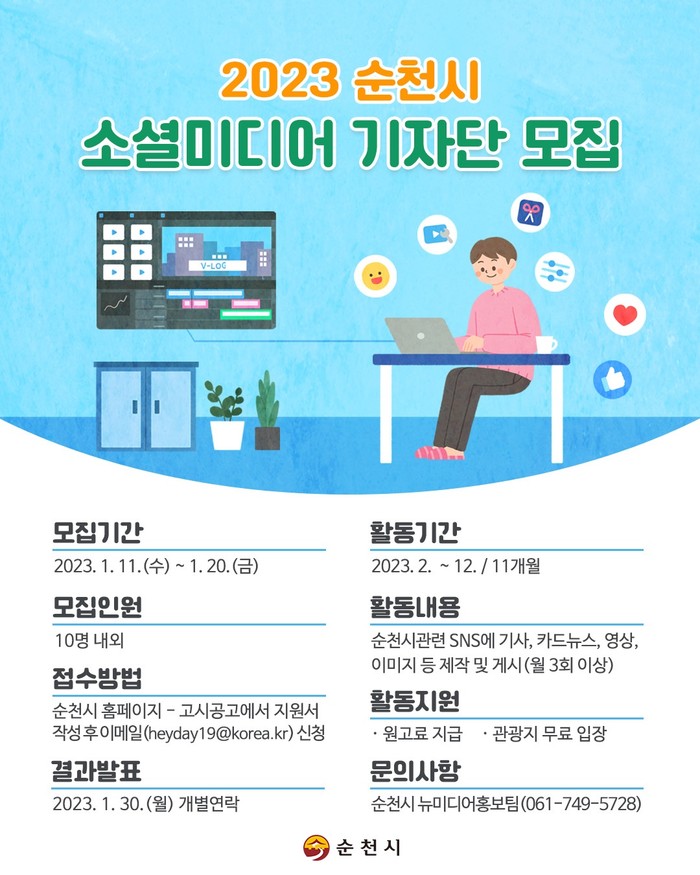 [전남=프레스뉴스] 강래성 기자= 순천시(시장 노관규)는 오는 20일까지 2023년 순천시 영상크리에이터와 소셜미디어기자(이하 ‘시민 크리에이터)’를 모집한다.