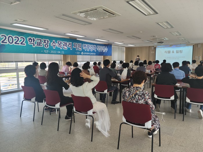[광주=프레스뉴스] 강래성 기자= 광주광역시교육연수원이 지난 22일 관내 초·중등 교장 대상으로 ‘2022년 학교장 수목 관리 지원 역량강화 직무연수’를 실시했다.