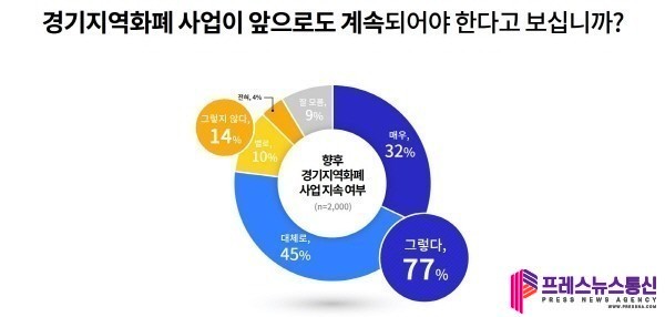 아울러 경기도민의 77%는 경기지역화폐 사업이 앞으로도 ‘계속돼야 한다’고 답했다.