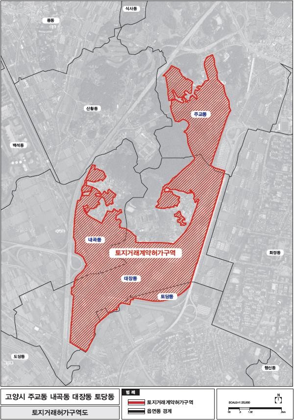 경기도는 지난 14일 경기도 도시계획위원회 심의를 거쳐 고양시 덕양구 토당동·주교동·대장동·내곡동 등 4개동(2.09㎢)과 시흥시 포동·정왕동 등 2개동(3.91㎢)을 토지거래허가구역으로 2023년 5월 30일까지 2년간 재지정한다고 26일 밝혔다.