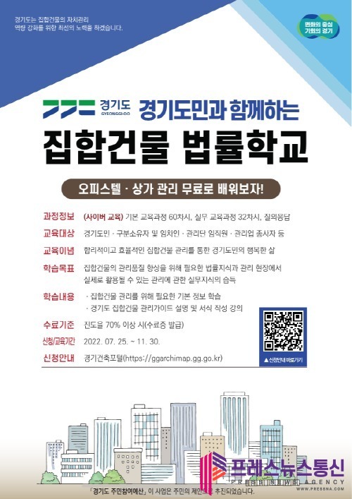[프레스뉴스] 장현준 기자= 경기도가 7월 25일부터 오피스텔 등 집합건물 관련 법률과 실무지식을 안내하는 온라인 교육과정 ‘경기 집합건물 법률학교’를 무료로 제공한다.