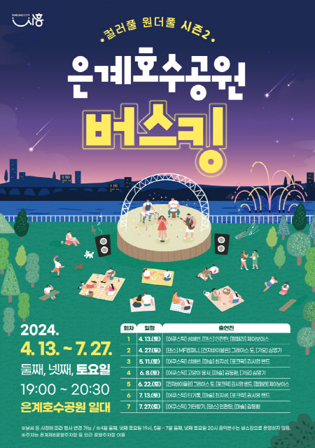 올해는 4월 13일 시작했다. 은계호수공원에서는 둘째, 넷째 주 토요일 저녁 19시에 <컬러풀 원더풀 시즌2>가, 거북섬에서는 둘째, 넷째 주 토요일 오후 4시에 <버스킹 라이브 인 거북섬> 공연이 진행된다. 시흥시는 이 두 곳 이외에도 버스킹을 확대 추진하며 시민들의 더 풍요로운 일상을 응원할 계획이다.