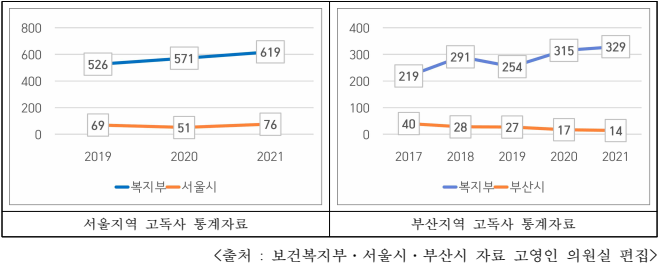 최근 3년간(2019~2021) 서울지역 기준 고독사가 복지부는 526건-571건-619건(연평균 572건), 서울시는 69건-51건-76건(연평균 65건) 발생했다. 부산지역은 최근 5년간(2017~2021) 복지부는 219건-291건-254건-315건-329건(연평균 282건), 부산시는 40건-28건-27건-17건-14건(연평균 25건)으로 연평균 11배 이상 차이가 발생했다. 또한 복지부 조사에서 부산지역의 경우 고독사 수가 증가한 반면, 부산시는 오히려 감소했다.