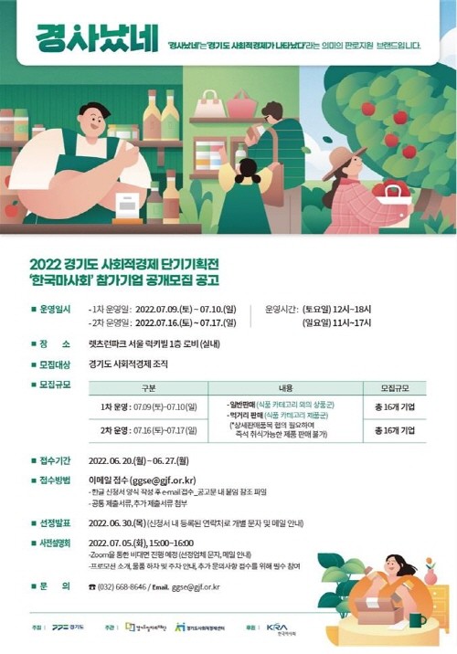 [프레스뉴스] 장현준 기자= 경기도가 사회적경제 제품 판로 확보를 위해 한국마사회 렛츠런파크 서울(과천시 소재)에서 열리는 ‘사회적경제 단기기획전’에 참여할 도내 사회적경제 기업을 오는 27일까지 모집한다.