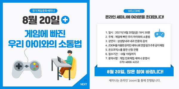 월 1회 진행되는 ‘경기 게임문화 세미나’는 게임을 잘 이해해 자녀와 소통하고 싶은 보호자와 향후 게임과 관련된 직업을 갖고 싶은 청소년 등을 위해 비대면 온라인 생방송으로 진행되는 게임 진로·커뮤니케이션 세미나다.