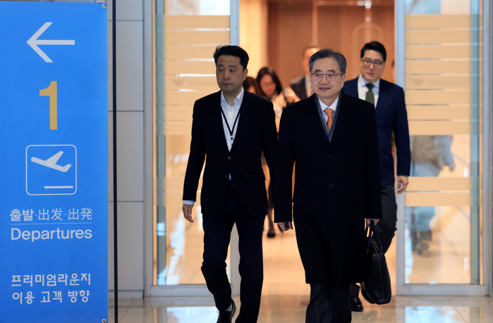 | ▲조현 외교부 장관이 3일 인천공항을 통해 워싱턴으로 출국하고 있다. 조 장관은 미국을 방문해 핵심광물회의 참석 및 마크 루비오 한미 외교장관 회담을 갖는다./사진=뉴스1 |