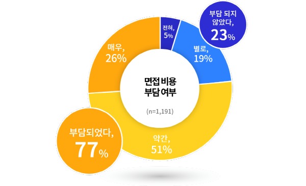 면접 1회당 평균 지출 금액은 ▲5만원 미만(50%) ▲5만원 이상~10만원 미만(32%) ▲10만원 이상~15만원 미만(10%) ▲15만원 이상~20만원 미만(4%) ▲20만원 이상(4%) 등으로 절반은 면접 1회당 5만원 이상을 사용했다.