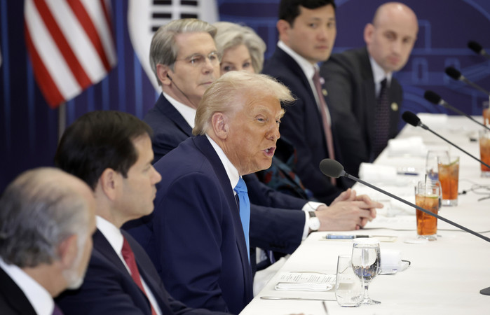 | ▲도널드 트럼프 미국 대통령이 29일 경북 경주박물관에서 이재명 대통령과 정상회담을 하고 있다./사진-뉴스1 |
