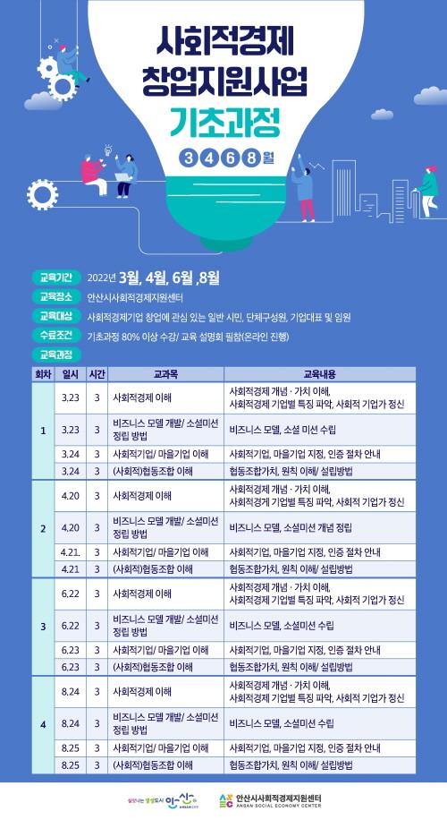 사회적경제 창업지원사업 교육과정은 경기도와 안산시가 주최하고 안산시사회적경제지원센터가 주관하는 사업으로, 사회적경제기업에 관심 있는 안산시민이면 누구나 신청할 수 있다.