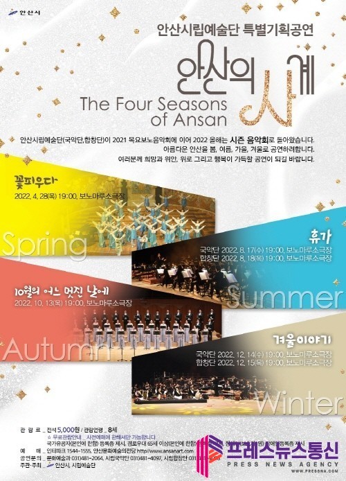 이영분 문화예술과장은 “계절별로 펼쳐질 ‘안산의 사계’ 공연을 통해 많은 시민이 위로와 희망을 얻길 바란다”며, “앞으로도 시의 문화적 가치를 높이고 시민들에게 문화향유의 기회를 확대할 수 있도록 노력하겠다”고 말했다.