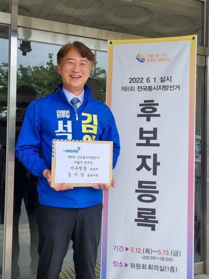 [광주=프레스뉴스] 강래성 기자= 김이강 더불어민주당 서구청장 예비후보는 12일 오후 광주 서구 선거관리위원회에서 ‘6‧1지방선거 후보자 등록’ 절차를 마치고 본선거 레이스에 뛰어들었다.