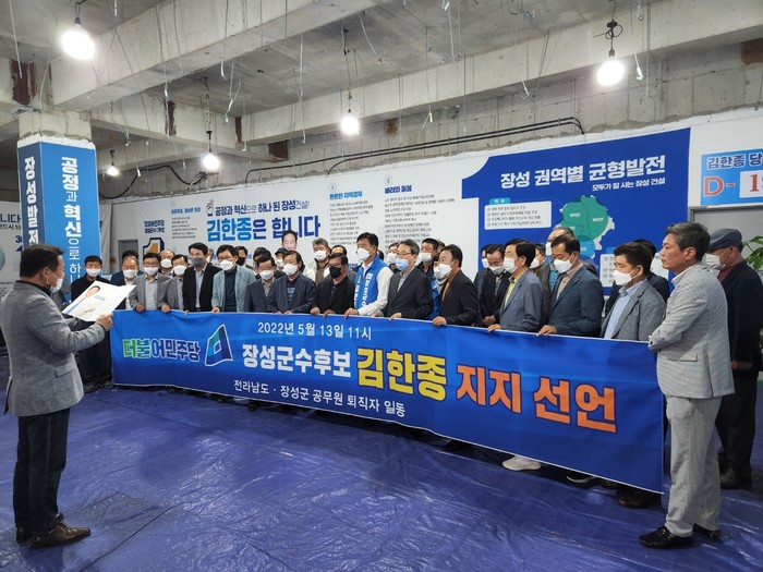 [전남=프레스뉴스] 강래성 기자= 13일 오전 11시 전남도청 및 장성군청 공무원 퇴직자 일동 60여명이 김한종 더불어민주당 장성군수 후보 선거사무소에서 지지를 선언하였다.