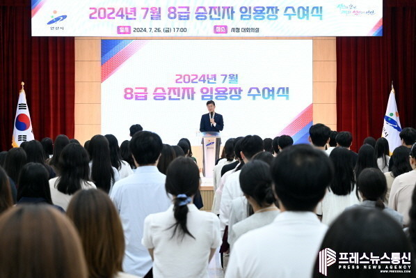 [프레스뉴스] 장현준 기자= 안산시(시장 이민근)는 지난 26일 시청 대회의실에서 최근 8급으로 승진한 신규 공무원 120명을 대상으로 임용장 수여식을 진행했다고 27일 밝혔다.