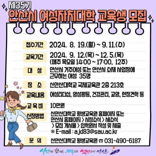 | ▲제35기 안산시 여성자치대학 수강생 모집 포스터(사진=안산시) |