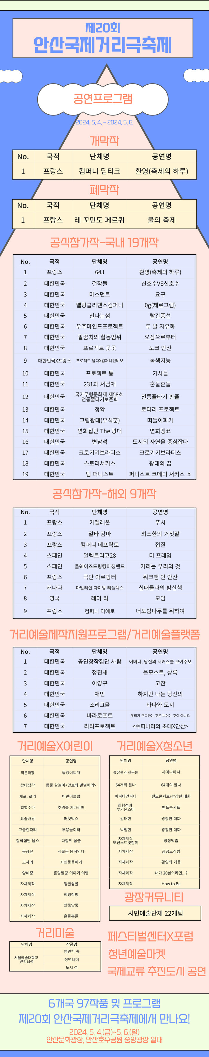 제20회 안산국제거리극축제의 자세한 라인업은 안산국제거리극축제 공식 누리집(홈페이지)을 참고하면 된다. 사전 예약이 필요한 일부 작품의 경우 네이버 예약페이지를 통해 지난 5일부터 통합 예매를 하고 있다.