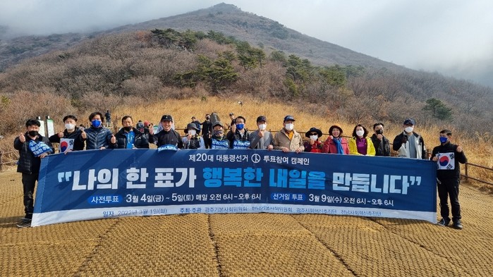 [광주=프레스뉴스] 강래성 기자= 광주·전남 기본사회 위원회와 광주·전남 사회혁신추진단은 3·1절인 1일 무등산 증심사와 중머리재 구간에서 제20대 대통령선거 사전투표 독려 및 줍깅 캠페인을 전개했다.