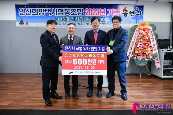 [프레스뉴스] 장현준 기자= 안산시(시장 이민근)는 지난 20일 안산희망택시협동조합으로부터 가족 송년회에서 교통약자지원을 위한 후원금 500만원을 기탁받았다고 21일 밝혔다.