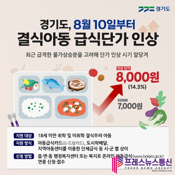[프레스뉴스] 장현준 기자= 급격히 오르는 물가에 맞춰 급식 지원단가를 높여야 한다는 지적이 사회 곳곳에서 제기되는 가운데 경기도가 8월 10일부터 결식아동 급식단가를 1식 7천 원에서 8천 원으로 14.3% 인상한다.