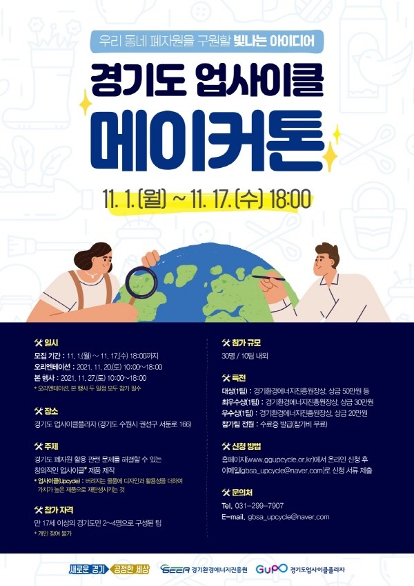 올해 처음 개최되는 이번 행사는 ‘경기도 폐자원 활용 관련 문제를 함께 고민해보고 해당 문제를 해결할 수 있는 창의적인 업사이클 제품 제작’을 주제로 진행된다.